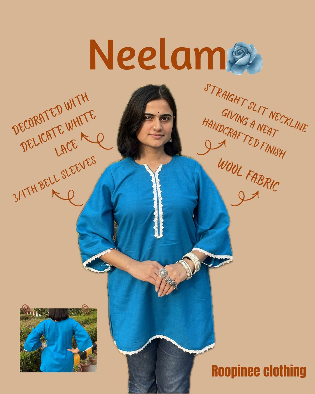 Elevate your everyday style with the Neelam Blue Kurti, a perfect blend of comfort, elegance, and handcrafted charm. Crafted from soft wool fabric, this kurti offers warmth while remaining lightweight and breathable—ideal for cooler days.