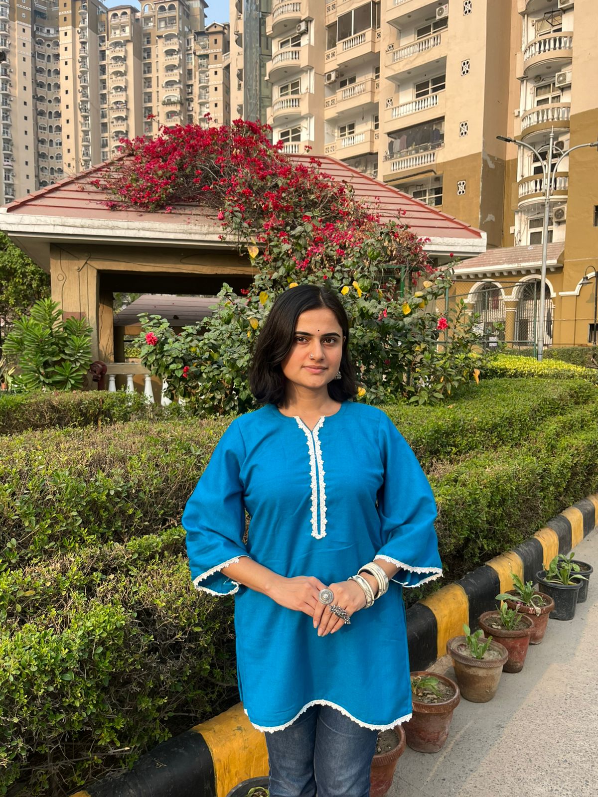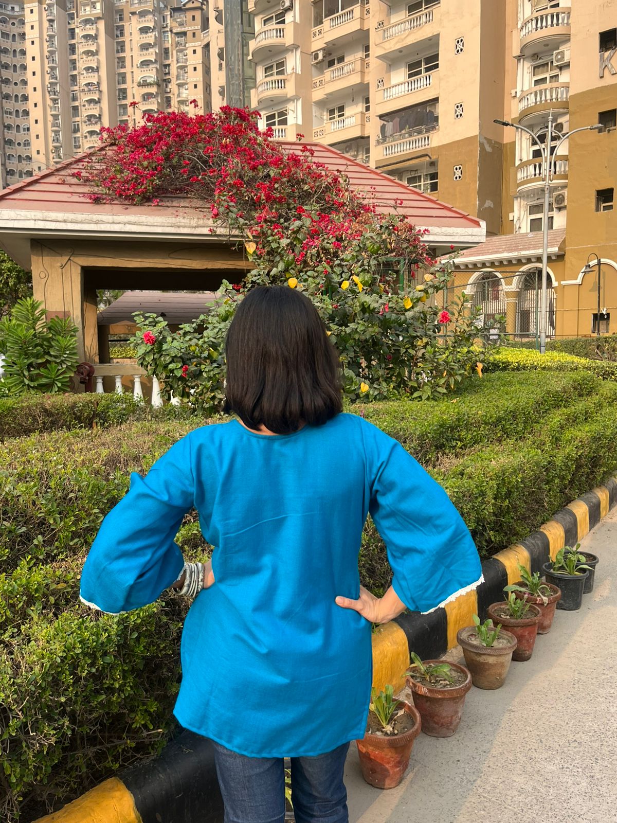 A timeless blue kurti crafted in soft wool fabric, featuring a straight slit neckline, delicate white lace detailing, and 3/4th bell sleeves for an elegant handcrafted finish.